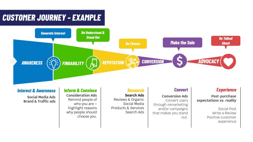 They need to move through a series of touchpoints through the stages of the marketing funnel shown below before they can make a purchase decision. Now is the time to move potential customers through those first initial stages of the journey; particularly awareness, finability and reputation, in order to get them through to convert and become brand advocates.